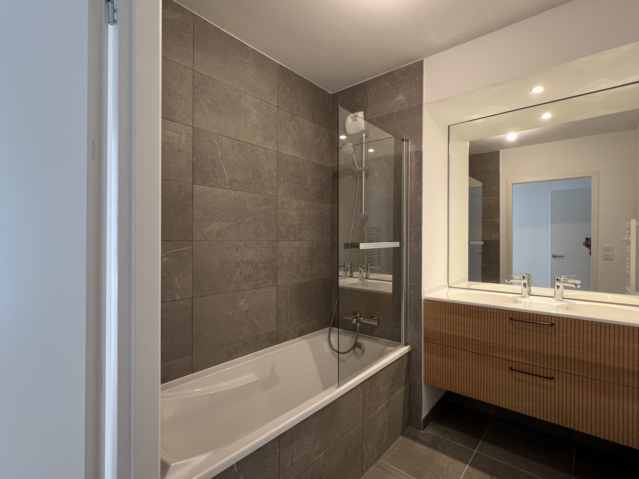 Une salle de bains familiale équipée d’une baignoire, d’une double vasque, alliant confort et fonctionnalité.