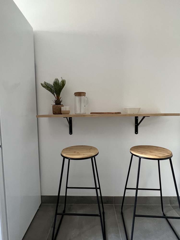 La rénovation de l’appartement a consisté à créer une nouvelle chambre, déposer les papiers peints, changer les sols carrelés, changer la salle de bain et customiser la cuisine.