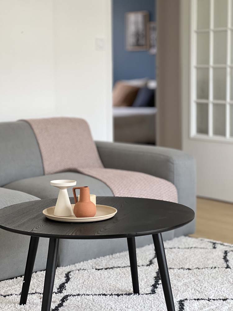 Côté salon, nous avons posé une cloison entre le salon et la salle à manger afin de créer la troisième chambre. Le bien a ensuite été complètement aménagé avec un pack meuble et décoré dans une ambiance contemporaine et chic grâce à des meubles et décorations soigneusement sélectionnés comme un banc en bouclette, un canapé bas, une table à manger et des chaises design rappelant des modèles iconiques telles que la table Tulip Eero Saarinen et les chaises Cesca B32 par Marcel Breuer