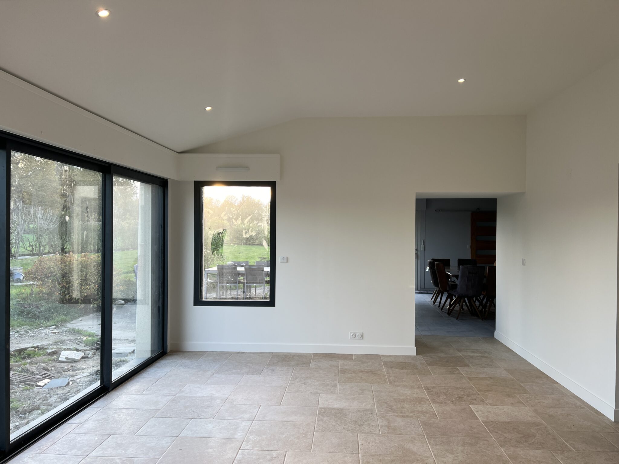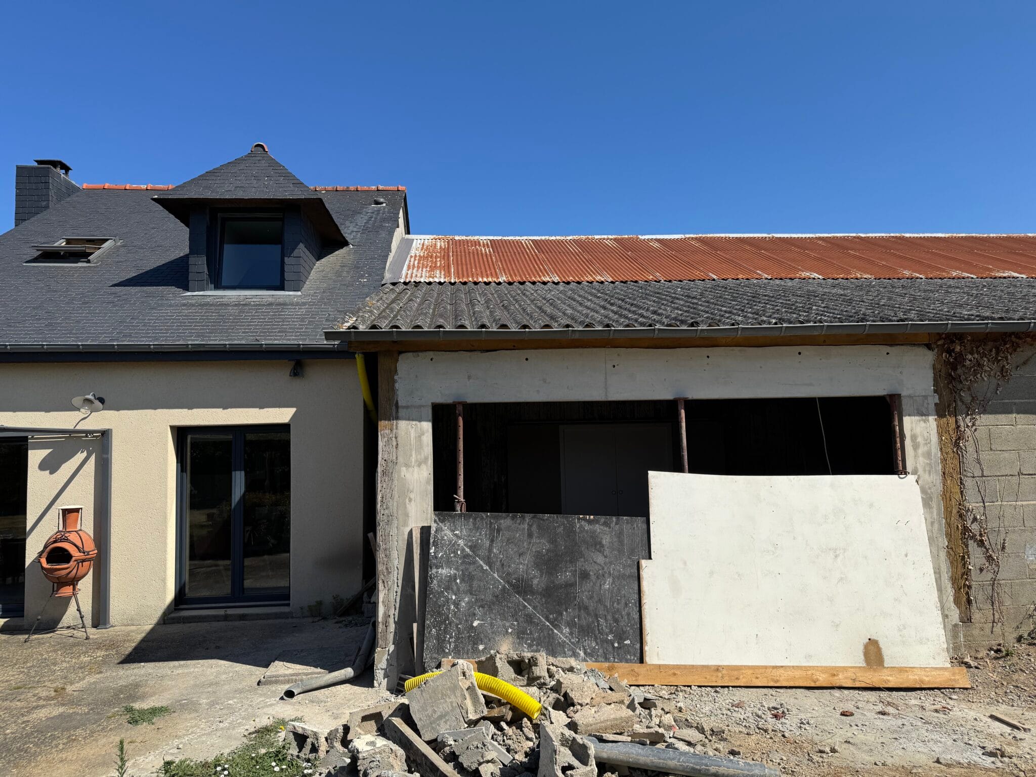 Transformation d’une dépendance d’une longère en salon et création d’un accès dans la maison existante. 25m2 d’espace supplémentaire baigné de lumière.