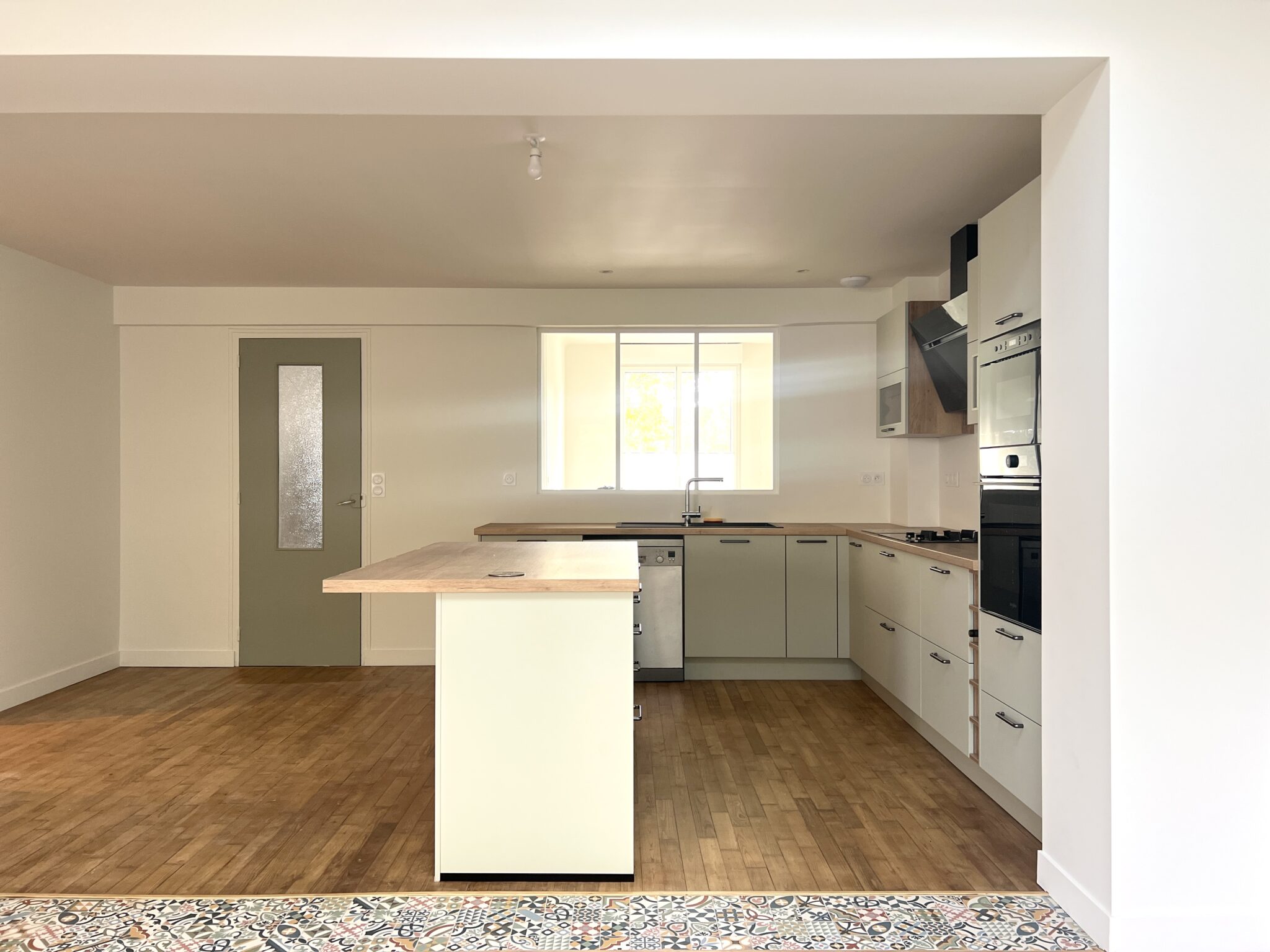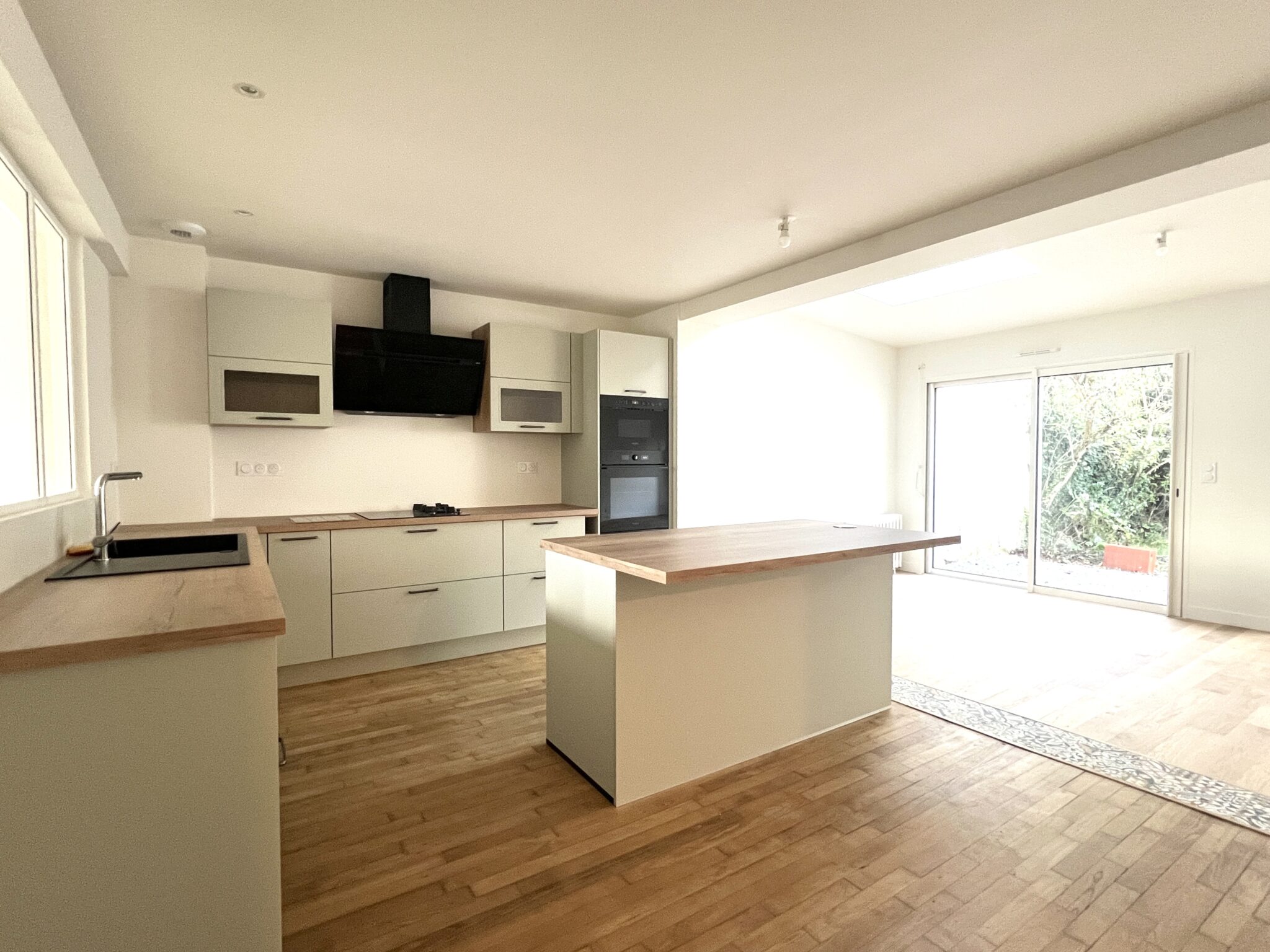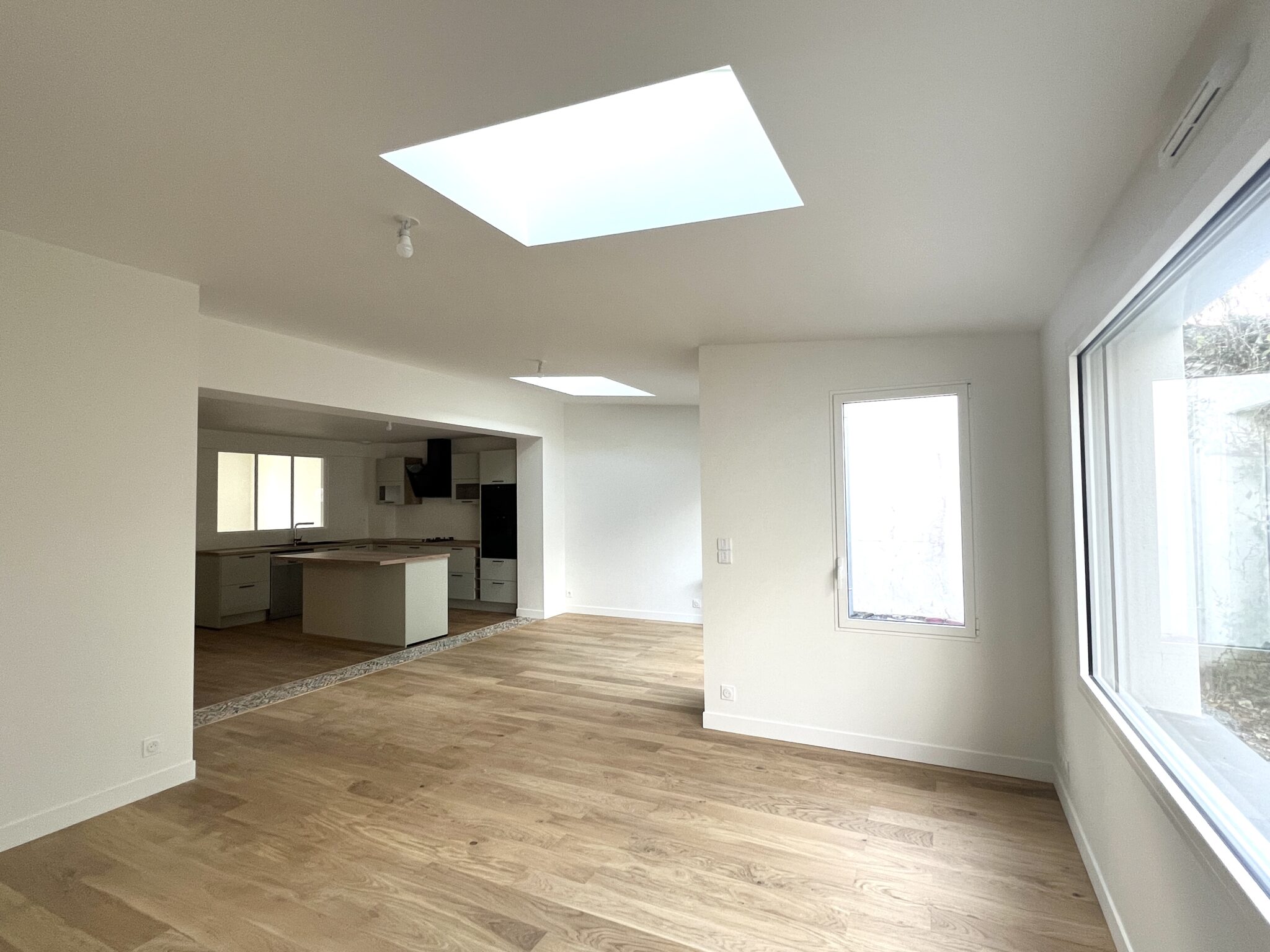 Les clients ont opté pour une cuisine ouverte et de grandes fenetres dans le salon afin de bénéficier d’un maximum de luminosité. La fenetre bandeau de grande dimension fait entrer le jardin dans la maison comme un tableau.