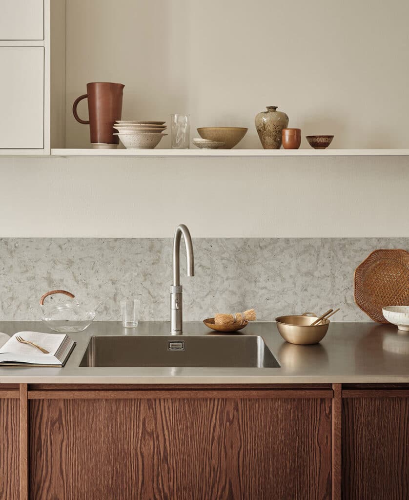 Mixer le noyer avec de la pierre naturelle (marbre noir ou terrazzo) et des accessoires en laiton ou en céramique plutôt brutaliste. Optez plutôt pour un plan de travail fin afin de garder une ligne épurée.