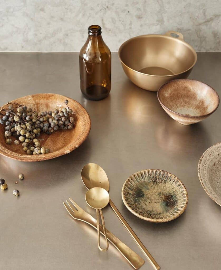Sur ce modèle, une simple étagère a été peinte dans la même couleur que les murs pour la rendre plus légère et ainsi sublimer la vaisselle. Ici la styliste a sélectionné des accessoires de cuisine dans une palette de couleurs beige brun chaud qui donnent beaucoup de personnalité à l’ensemble.