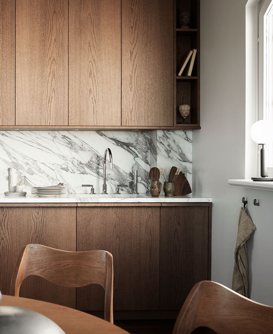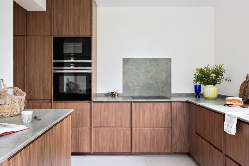 Rien à voir avec les bois des années 80 évidemment. Au contraire, cette nouvelle tendance de cuisine met en valeur des tiroirs épurés en noyer massif, chaleureux et riches. Le look est épuré et les matériaux minimalistes. Ce n’est ni rustique ni traditionnel, le style est vraiment moderne tout en étant intemporel.